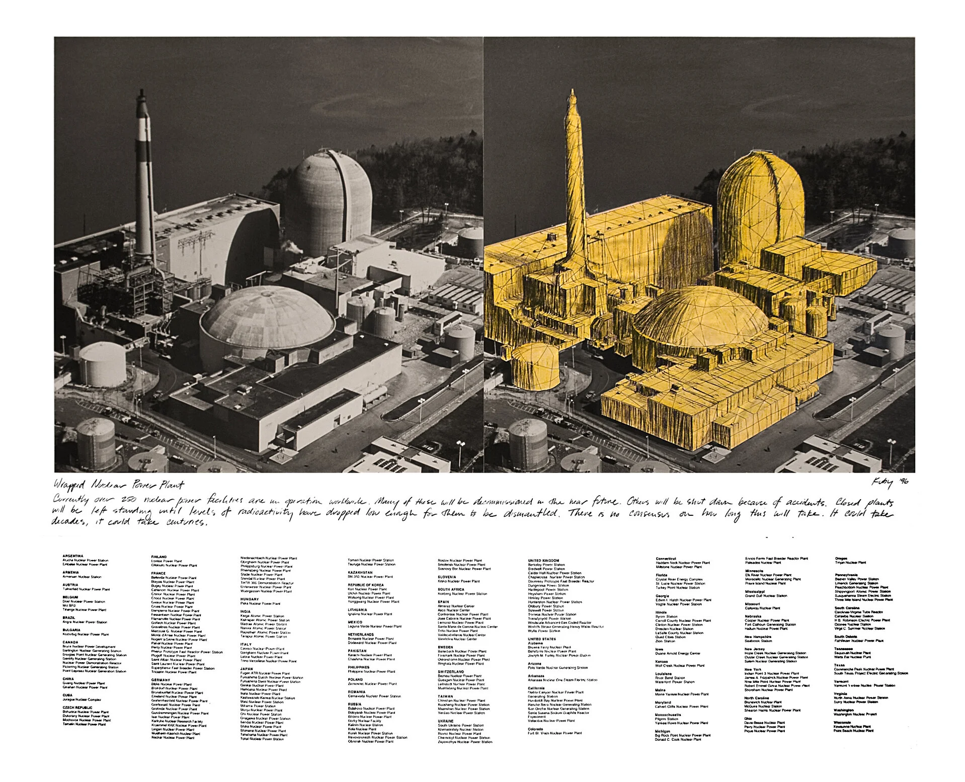 An impossibly unrealistic proposal a la Christo to shroud a damaged or decommissioned nuclear power plant in lead-encased safety yellow fabric. Below the image are listed all the 250+ plants in existence at the time. When I first came up with the idea I thought it might actually be a practical solution. I quickly realized how dangerous, inadequate and probably futile it would be––which is really the point needing to be made.